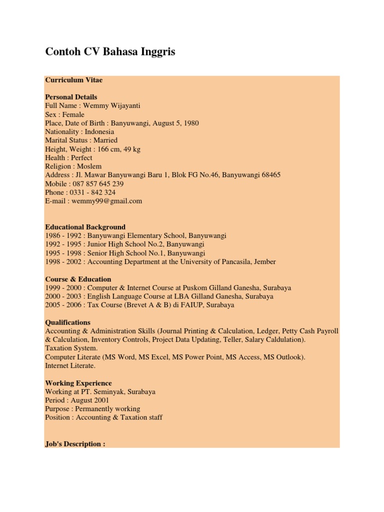 Contoh CV Bahasa Inggris | Invoice | Accounting